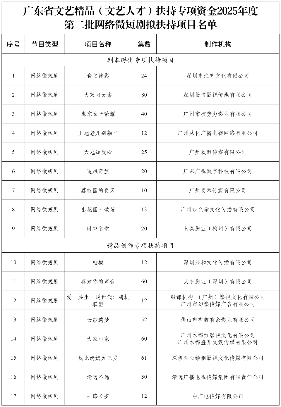 根据《关于申报2025年度广东省文艺精品(文艺人才)扶持专项资金电视剧及网络剧片剧本孵化、精品创作、播出激励项目的通知》(粤广电剧〔2025〕1号),经专项评审程序,拟对2025年度第二批17个网络微短剧项目给予扶持,现予以公示。公示时间从2025年12月3日至12月9日止。若对扶持项目有异议,请实名电话并书面向省局网络视听节目管理处反映。
